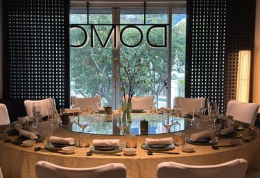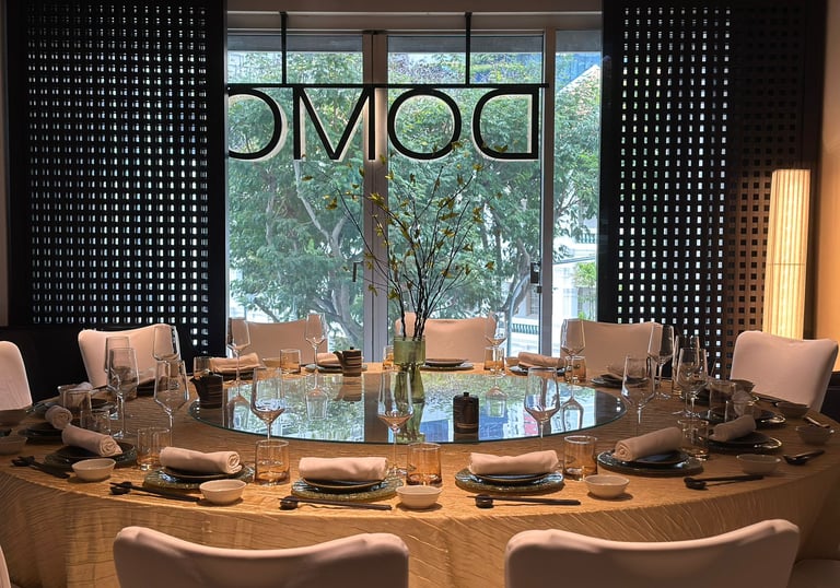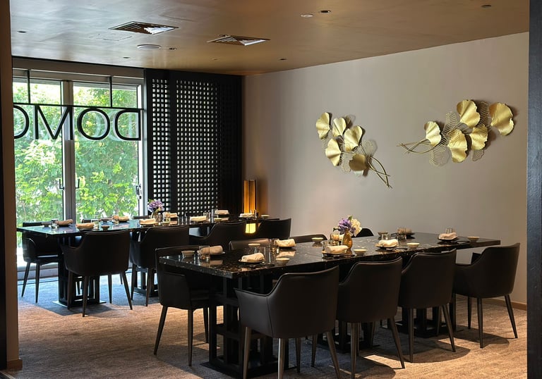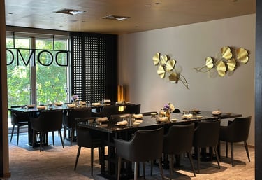 Highlight the floor-to-ceiling windows, the reversed "DOMO" glass decal, and the vibrant greenery outside, which provides excellent natural lighting for daytime events.
