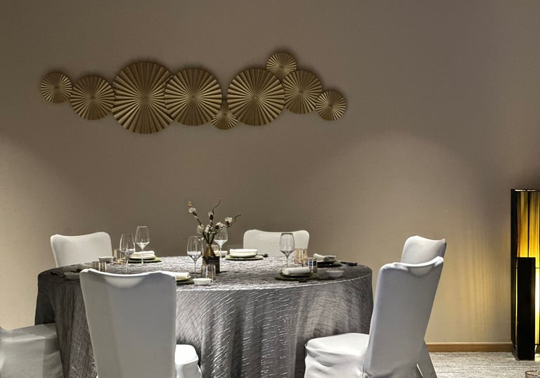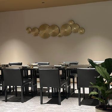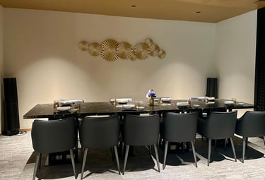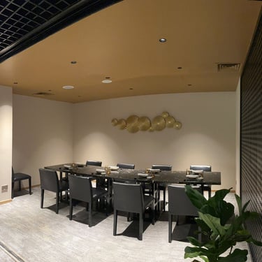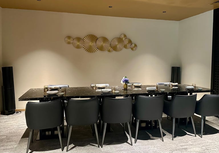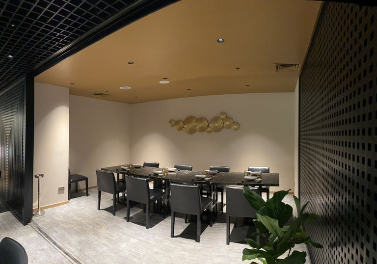 A masterclass in contemporary elegance for up to ten guests. This beautifully appointed room is anchored by a striking black marble dining table paired with plush leather seating. The modern Japanese-inspired décor is elevated by warm, ambient lighting and striking gold wall art, offering a highly exclusive and glamorous setting.