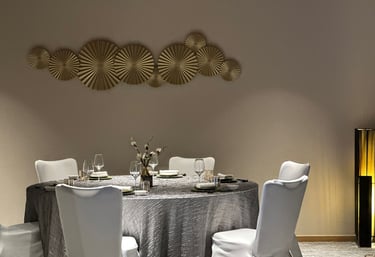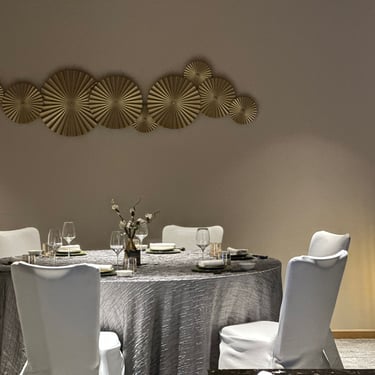 A radiant, multi-layered metallic sunburst installation that anchors the room in warm, luxurious gold tones.